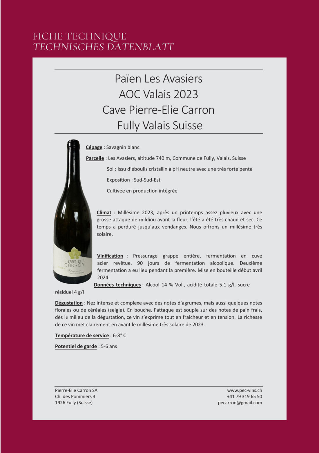 Les vins, issus des parcelles du coteau de Fully mais aussi de Chamoson et de Charrat, sont travaillés de manière très simple avec l’ambition d’exprimer la typicité de chaque cépage.