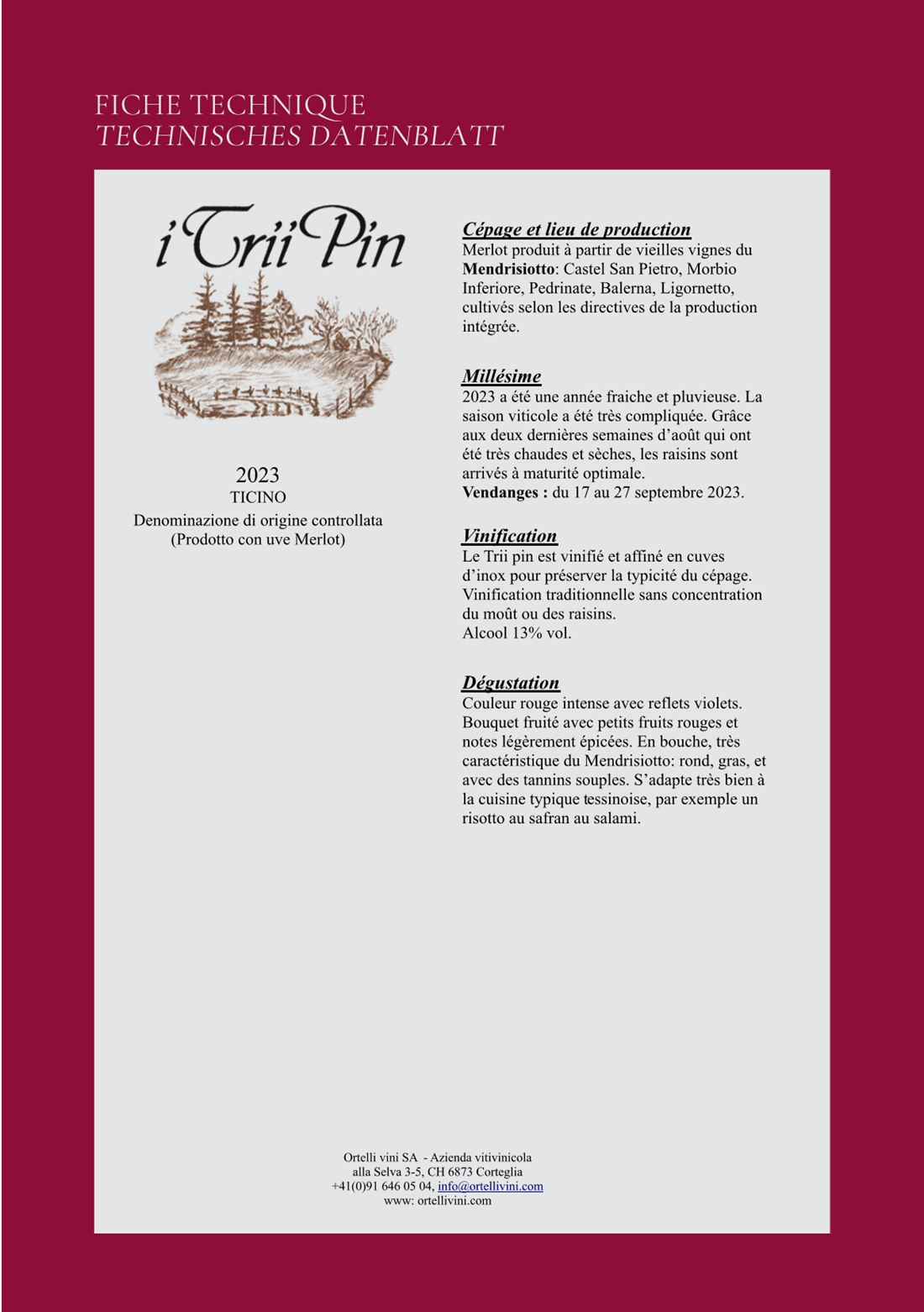 Je te propose notre Merlot "I Trii Pin" (en français: les trois pins) produit dans les vieilles vignes du Mendrisiotto. Découvre ses caractéristiques dans la fiche produit ci-dessous et pour le déguster en vrai (c'est encore mieux), passe commande directement sur notre site web.Â