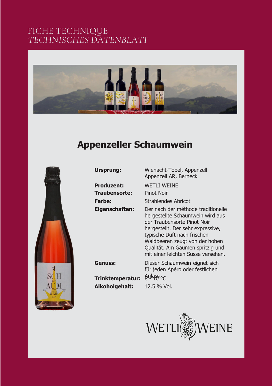 Je te propose un vin mousseux: l'Appenzeller Schaumwein. Découvre ses caractéristiques dans la fiche produit ci-dessous et pour le déguster en vrai (c'est encore mieux), passe commande directement sur notre site web.Â