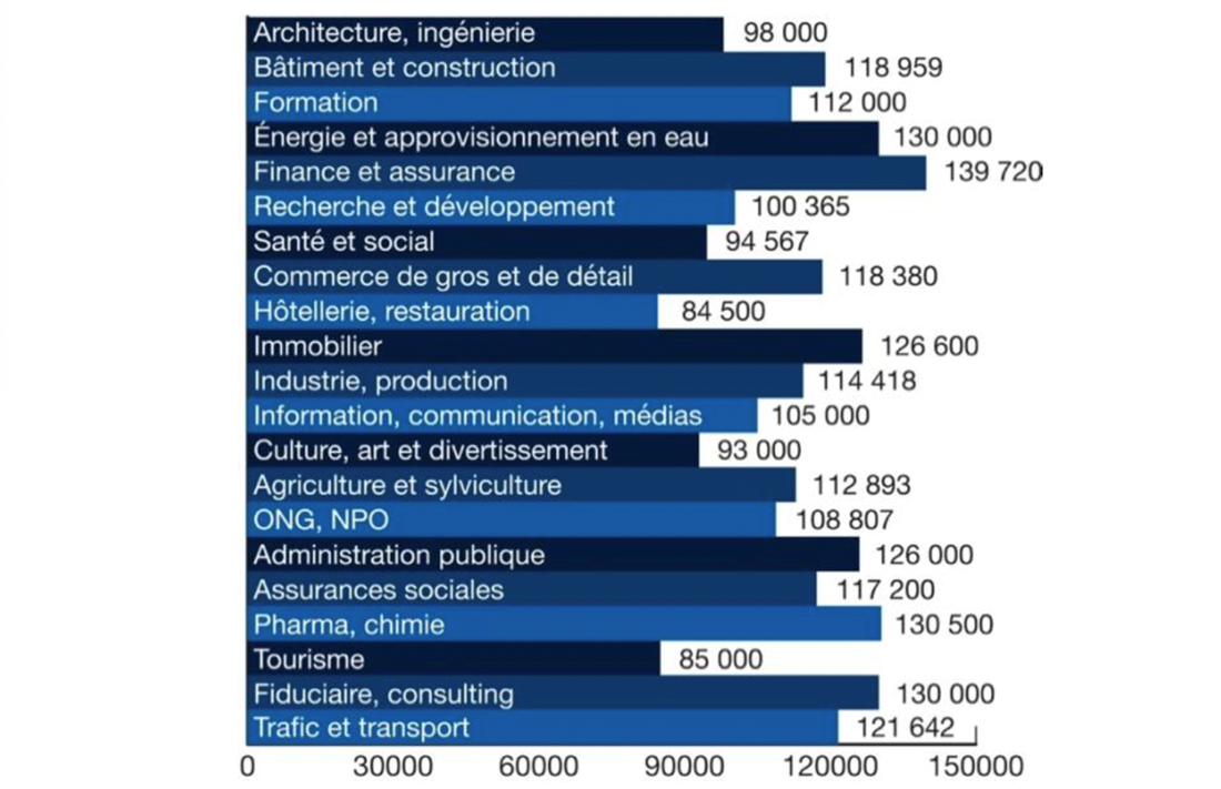 La composition des participants à l'enquête a toujours une influence sur les données salariales disponibles. Le salaire médian* de tous les participants en Suisse est de 112'852 francs par an. Comme les autres années, le secteur des finances et des assurances offre les salaires les plus élevés. En outre, les secteurs de la santé et du social ont rattrapé leur retard. La proportion d'hommes reste toutefois faible (26%).