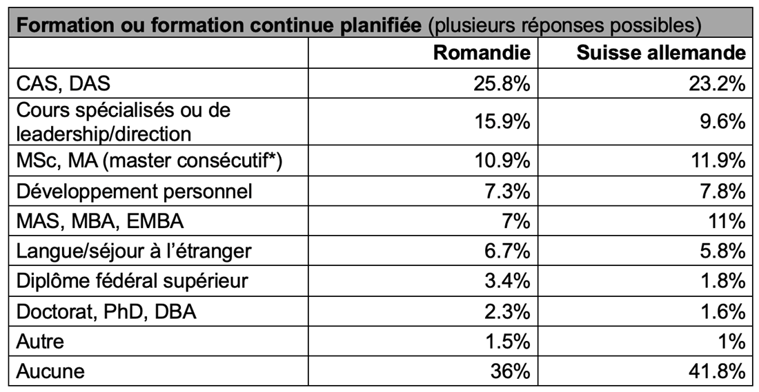Les participants à l'étude ont également été interrogés sur leur intention à suivre une formation ou une formation continue dans un avenir proche. L'intérêt pour la formation continue reste intact. Les formats courts comme les CAS et DAS sont clairement les plus appréciés. Les cours spécialisés ou de direction sont également très demandés en Suisse romande. Cette année, ils sont particulièrement nombreux à prévoir un master consécutif*. Dans l'ensemble, la volonté de formation continue est plus forte en Suisse romande qu'en Suisse alémanique. De plus, on remarque que les femmes sont plus intéressées par la formation continue que les hommes.